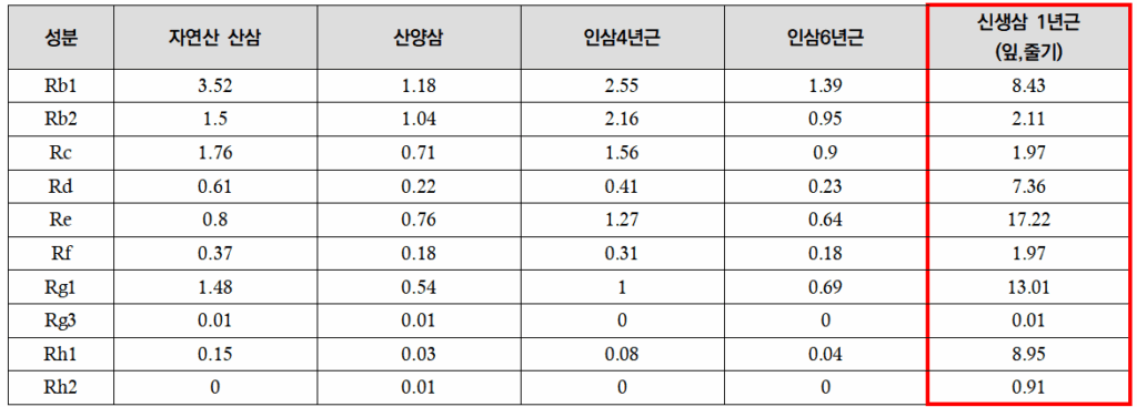 성분별로 농도(mg/g)를 정리하여 어떤 인삼 종류에서 어떤 성분이 더 높은지 쉽게 비교하실 수 있습니다.